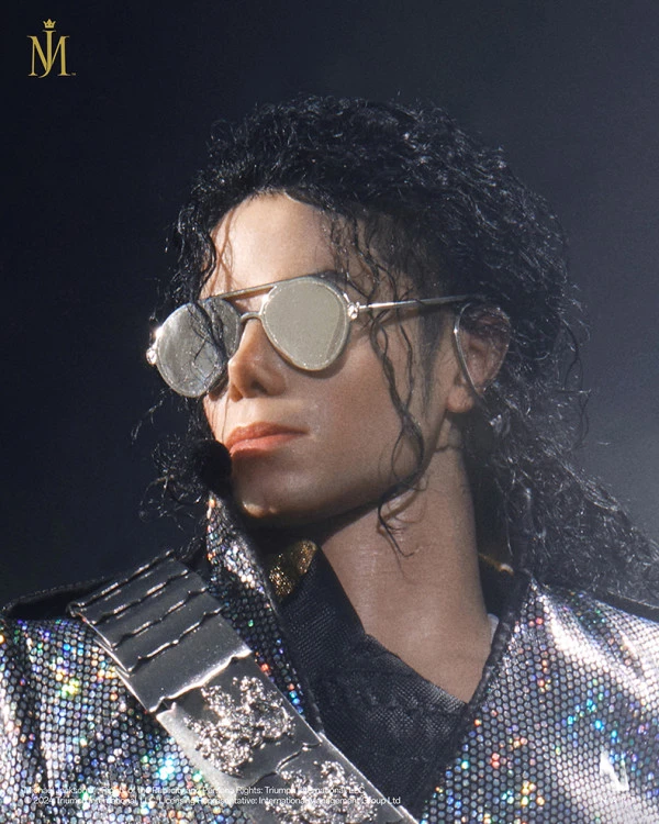 The model is approximately 37 cm tall (including the base) and is made of composite materials such as metal, resin, PVC, ABS, wool, and real fabric. It is equipped with a hair transplant movable eye head sculpt, sunglasses, and multiple hand shapes for replacement, recreating Michael Jackson’s classic image from his concerts.